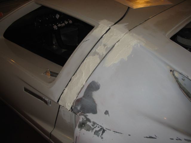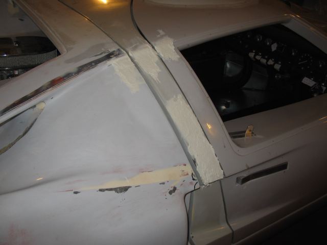 Off side. First application of 'SMC Fibre Filler' to the 'B Pillar'.
